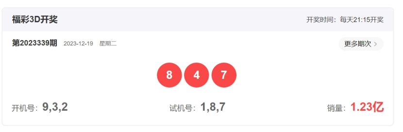 福彩3D第2023339期开奖号码为847,形态为组六,奇偶比1:2,和值19,跨度4,大小比:2:1,【012路个数比】:0:2:1。