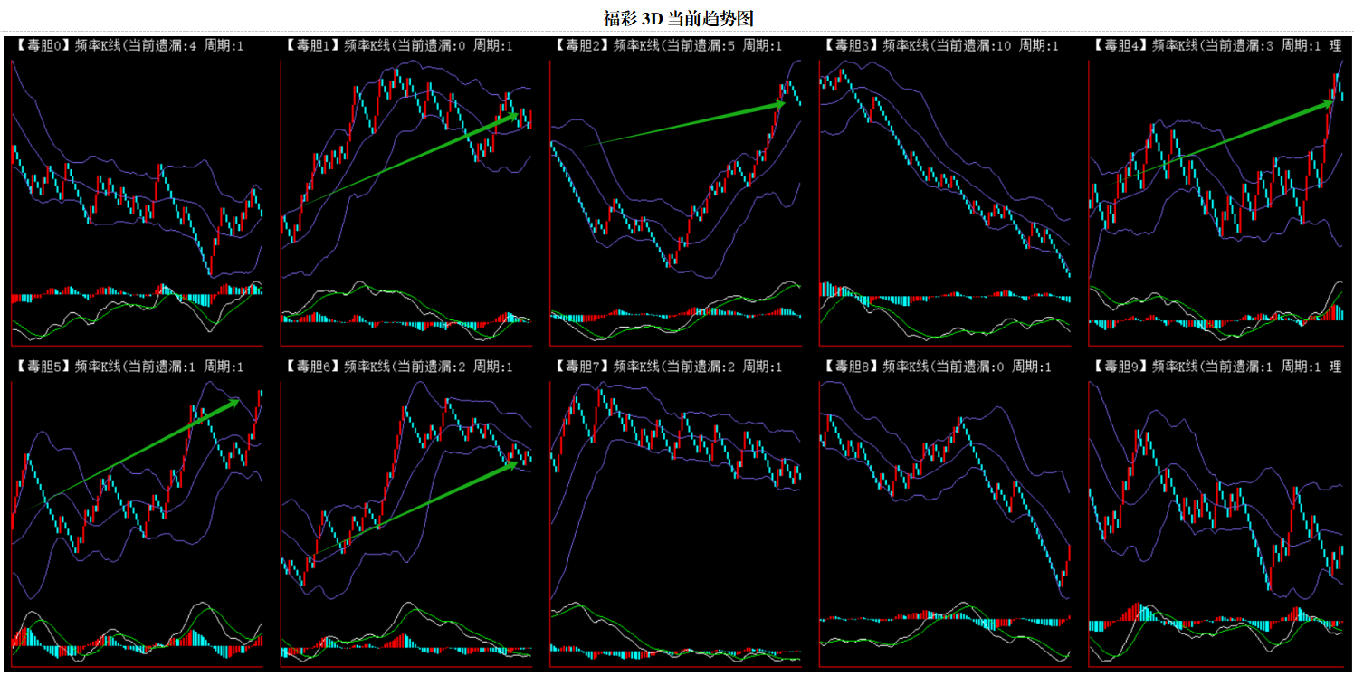 整体趋势上行,上边沿线趋势向上,下边沿趋势也是向上,节点震荡,当前遗漏2期,本期关注。