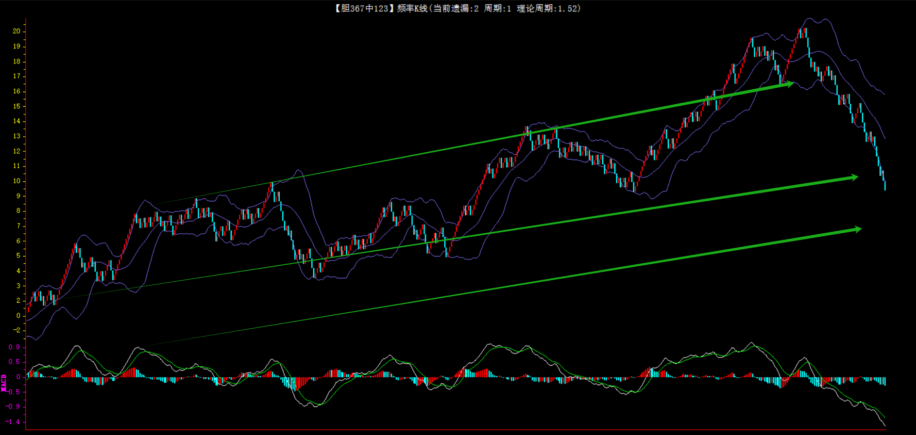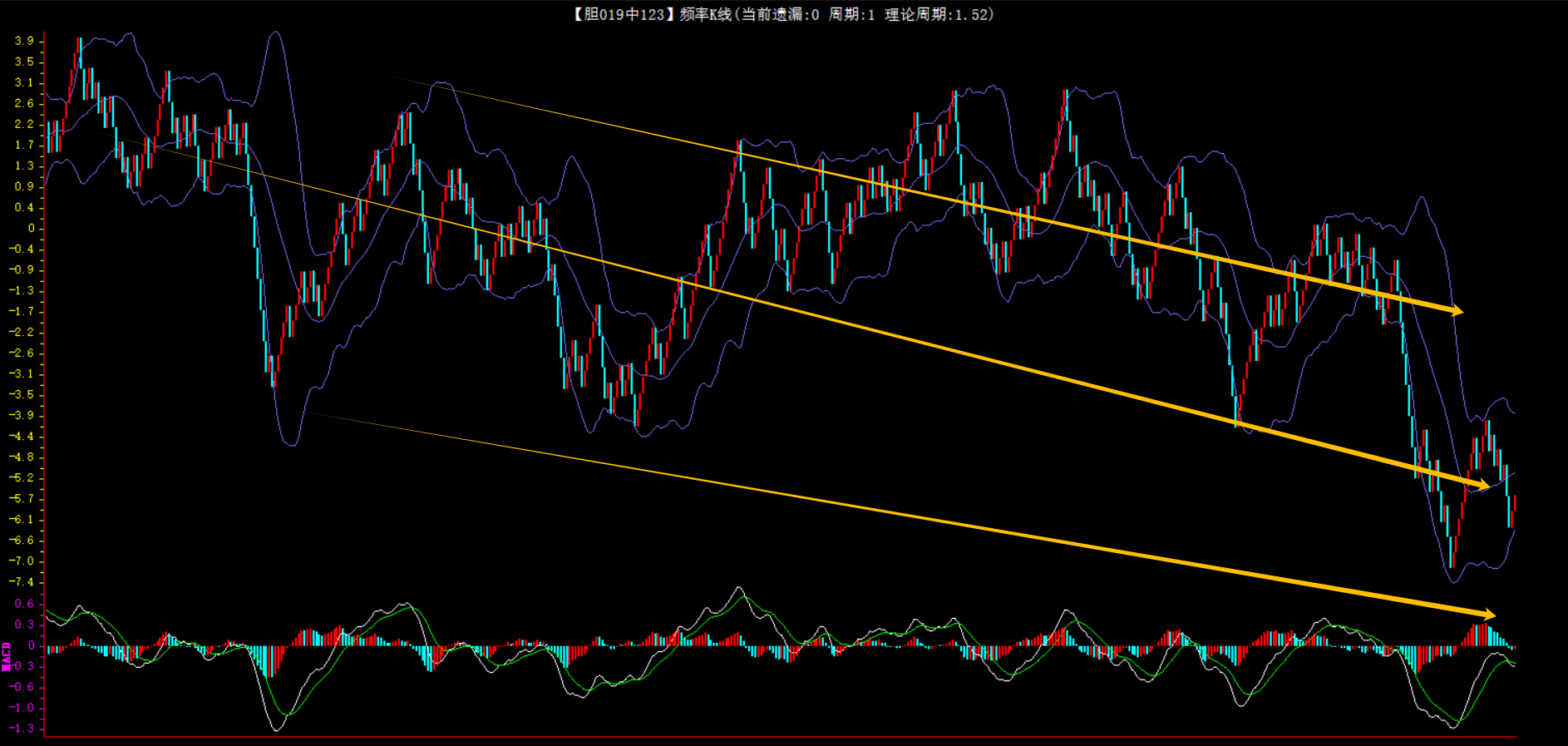 整体趋势下行,上边沿线趋势向下,下边沿趋势也是向下,节点震荡,当前连开2期,本期防守。