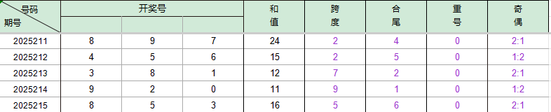 2025215期开奖号码853,我们可以看出近30期百位8出现5次,十位5出现5次,个位3出现4次。