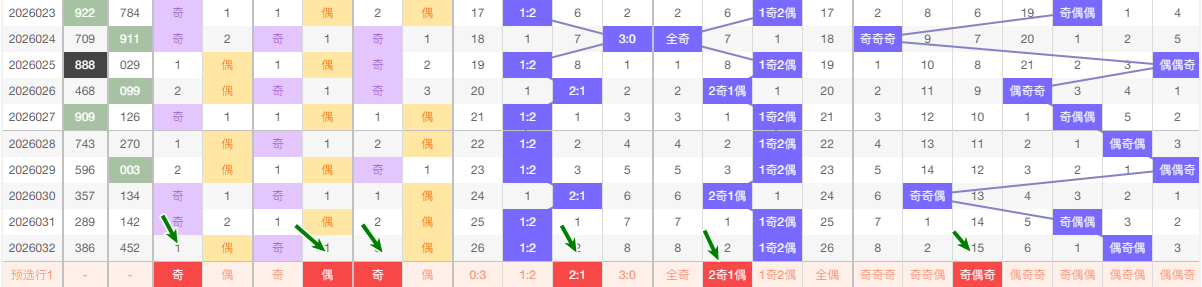 (二)、奇偶分析 奇数 13579 偶数 02468 在这5期 数据中 奇数出现6次 偶数出现 9次 从昨天出号来看偶数占优, 本期看好偶数有号 看好 奇偶偶奇 奇偶奇