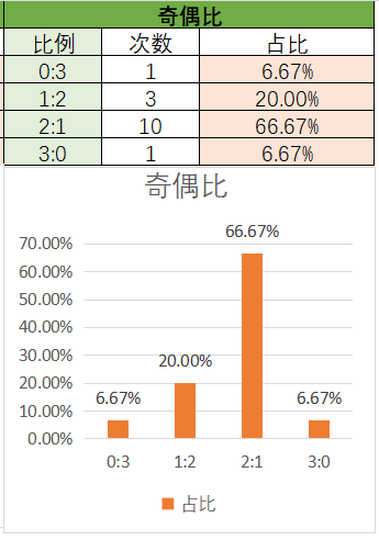 上期奇偶比为2:1,各个类型占比没有变化。近15期内2:1优势最好,然后是1:2,最后是3:0上期开了2:1奇偶比,本期还是看好2:1奇偶比的开出,其次是1:2