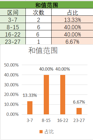 上期和值是16,处在16~22之间,其中16~22占比变大,8~15占比变小。目前是16~228~15占比最优,然后是3~7,最后是23~27。本期看好和值在8~15之间,其次是16~22