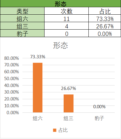 上期开的是组六,组六占比变大,组三占比变小。通过图示可以看到,组六在15期内开了11期,组三开了4期。本期关注组六,防组三