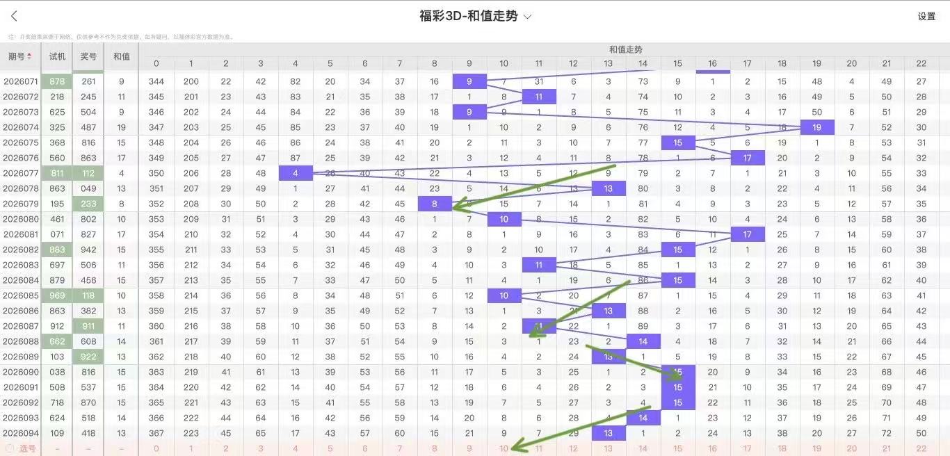 2026095期福彩3D和值走势图如下:上期开出和值13,和值在第2分区,而近百期开出和值13共8次,下期数据:11 19 10 17 8 11 15 根据和值13的下期钟摆走势来看上升趋势稳定,近期和值喜在第2分区活动,和值形态规律:奇:小和尾形态奇:小,那么本期重点推荐值范围是:9-19主奇形态