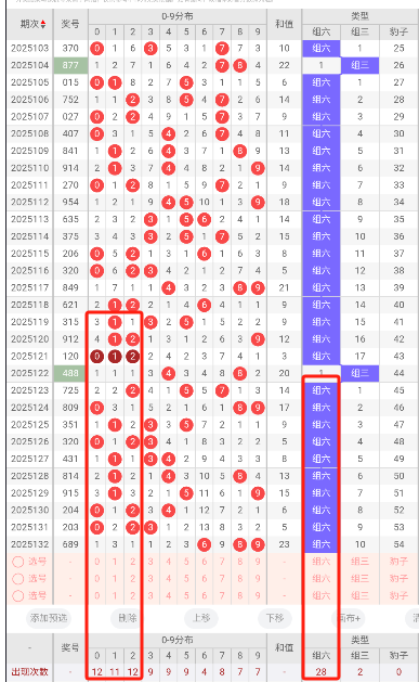 组三形态平均每4期出现1次,若连续10期未出可重点关注;组六形态占70%,可考虑间隔2期后介入。 -