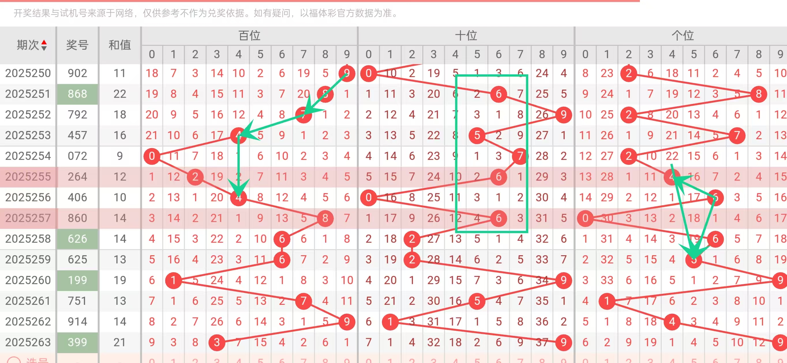 从百位走势看,数字在0-9之间波动,近期百位热号9(出现4次)已显疲态,数字5处于上升趋势的潜在起点。历史数据显示,百位数字常在小幅下降后反弹,数字5上次开出后已多期未现,符合反弹条件。