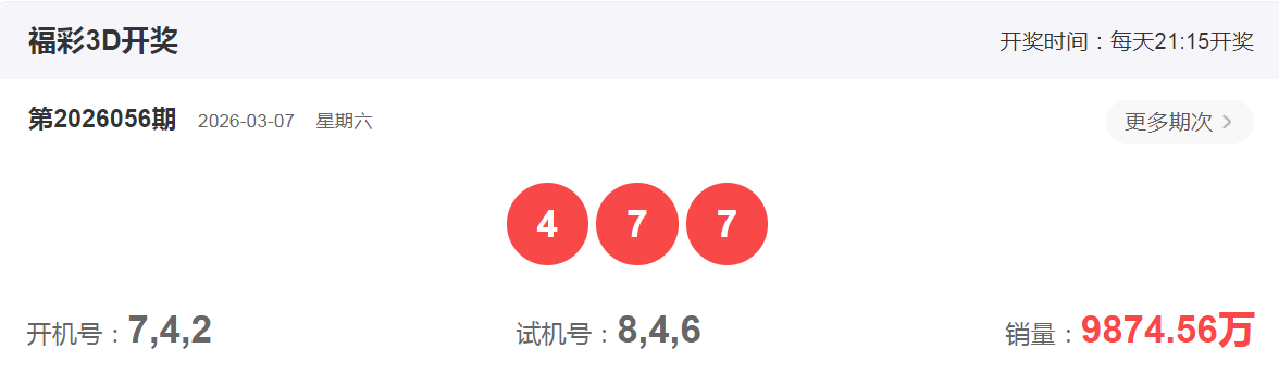 福彩3D2026年3月7日第056期开奖号码是477,组三形态,跨度3,和值18,全1路,小大大,偶奇奇