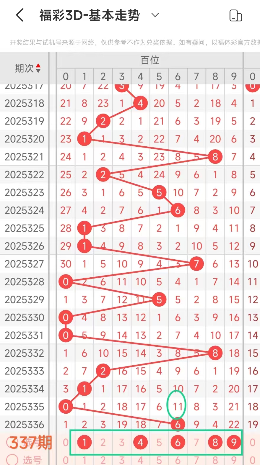 我们选取上期开奖号码641、在一起彩APP上截取前100期的数据,分别记录当开出百6、十4、个1、后下期开出什么号记录下来,然后一一分析。