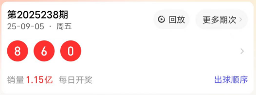 2025238期开奖号码为860,奇偶值为3偶;大小值为2大1小;012路走势为002路;跨度为8跨;和值14点;组六形态。