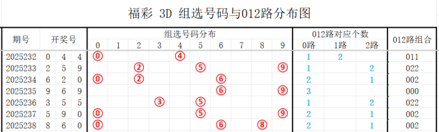 012路定义:0路为0369,1路为147,2路为258。请看开奖号对应012路分布图: