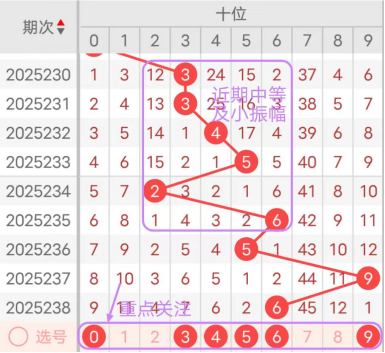 近7期(232~238)开奖号十位号码球分别为4、5、2、6、5、9、6,开奖号与上一期走出的振幅分别为1、1、3、4、1、4、3,232期走出4号中小数号码球,走出“1”的小幅度,233期走出5号大数号码球,走出“1”的小幅度,234期走出2号小数号码球,走出“3”的中小幅度,235期走出6号中大数号码球,走出“4”的中小幅度,236期走出5号中大数号码球,走出“1”的小幅度,237期走出9号大数号码球,走出“4”的中小幅度,238期走出6号中大数号码球,走出“3”的中小幅度;从振幅大小及走势图的整体对应来看,中大振幅走在3~6之间较为适宜,中小振幅走0~2之间较为适宜;结合走势图的上下对应及振幅大小分析,本期十位应重点关注号码球为0、3、4、5、6、9。