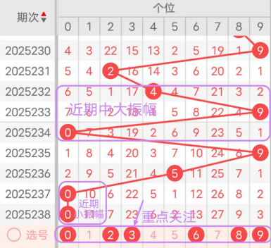 近7期(232~238)开奖号个位号码球分别为4、9、0、9、5、0、0,开奖号与上一期走出的振幅分别为2、5、9、9、4、5、0,232期走出4号中小数号码球,走出“2”的小幅度,233期走出9号大数号码球,走出“5”的中大幅度,234期走出0号小数号码球,走出“9”的大幅度,235期走出9号大数号码球,走出“9”的中大幅度,236期走出5号中大数号码球,走出“4”的中小幅度,237期走出0号小数号码球,走出“5”的中大幅度,238期走出0号小数号码球,走出“0”的小幅度;从近期振幅大小的走势及大小走势来看,中大振幅走在6~9之间较为适宜,中小振幅走在0~3之间较为适宜;结合走势图的整体及大小走势分析,本期个位应重点关注号码球为0、2、3、6、8、9。