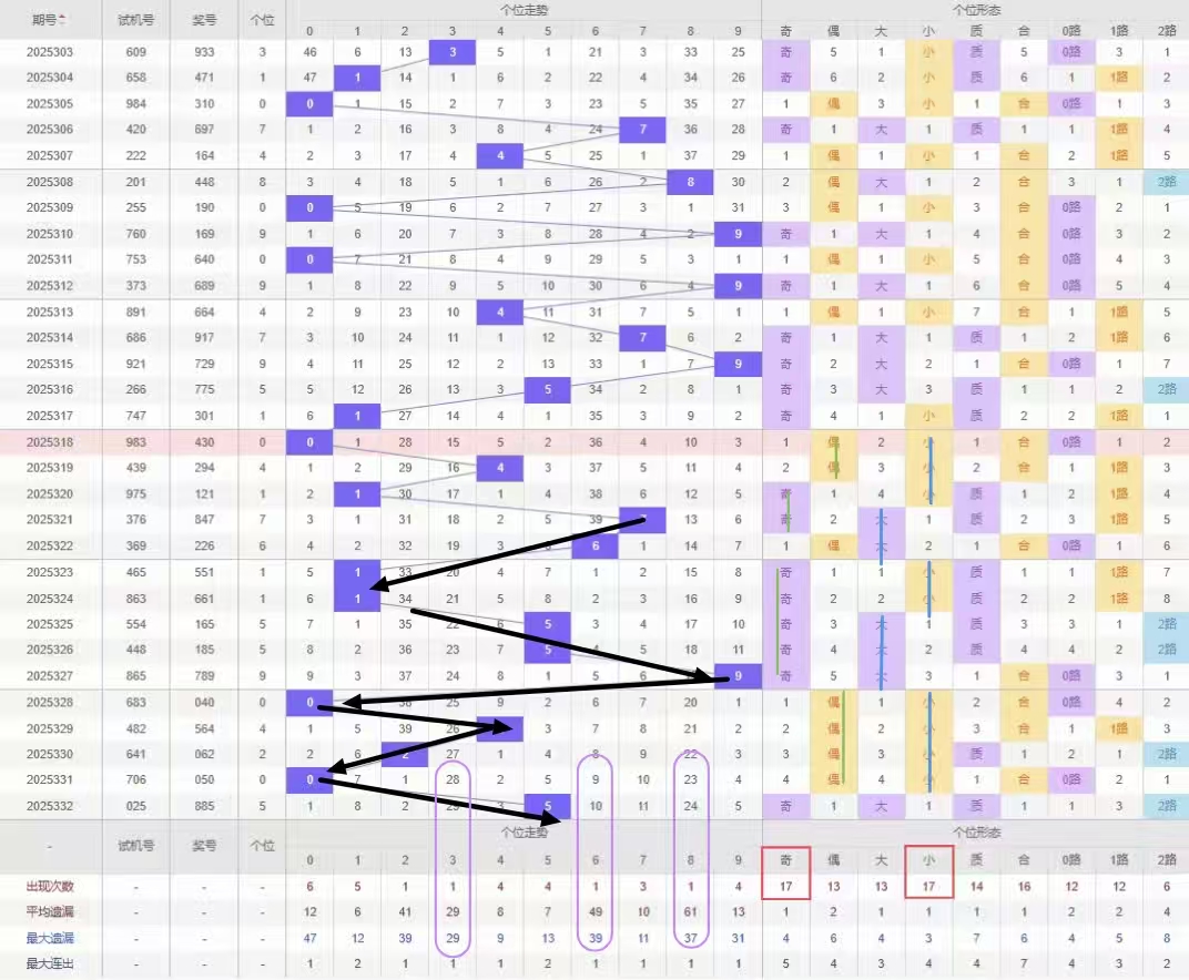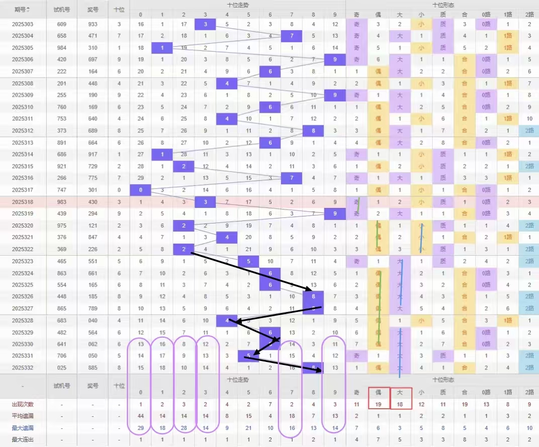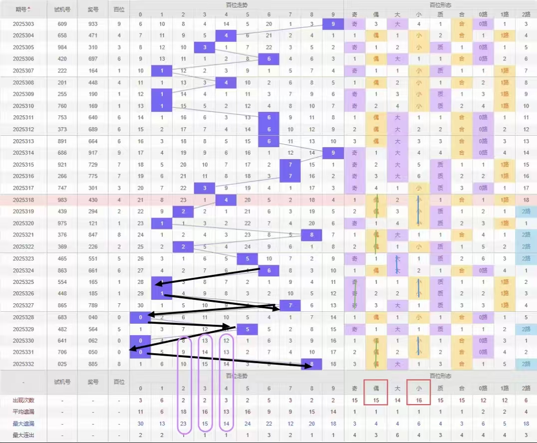 福彩3D第2025333期十位建议分析奇数偶数概率,如图所示近15期开出奇数号4期偶数号11期,开出偶数号的概率是开出奇数号概率的2倍多,上期开出偶数号那么本期继续开出偶数号的概率较大建议选择遗漏期数较大的偶数号。建议杀号定在所有奇数号,但奇数号1号、3号、7号、9号都已经遗漏了10期以上建议开出防冷号开。