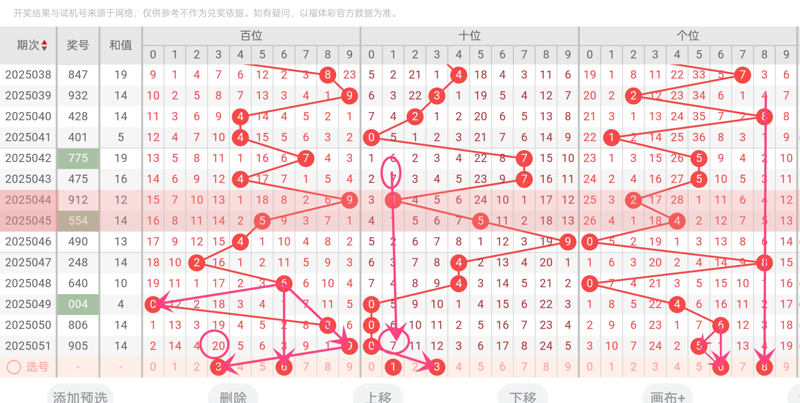 -十位“3”:十位“3”在2025038期8,4,7后已遗漏15期,结合其历史平均遗漏值(7期),冷态反弹概率超70%。