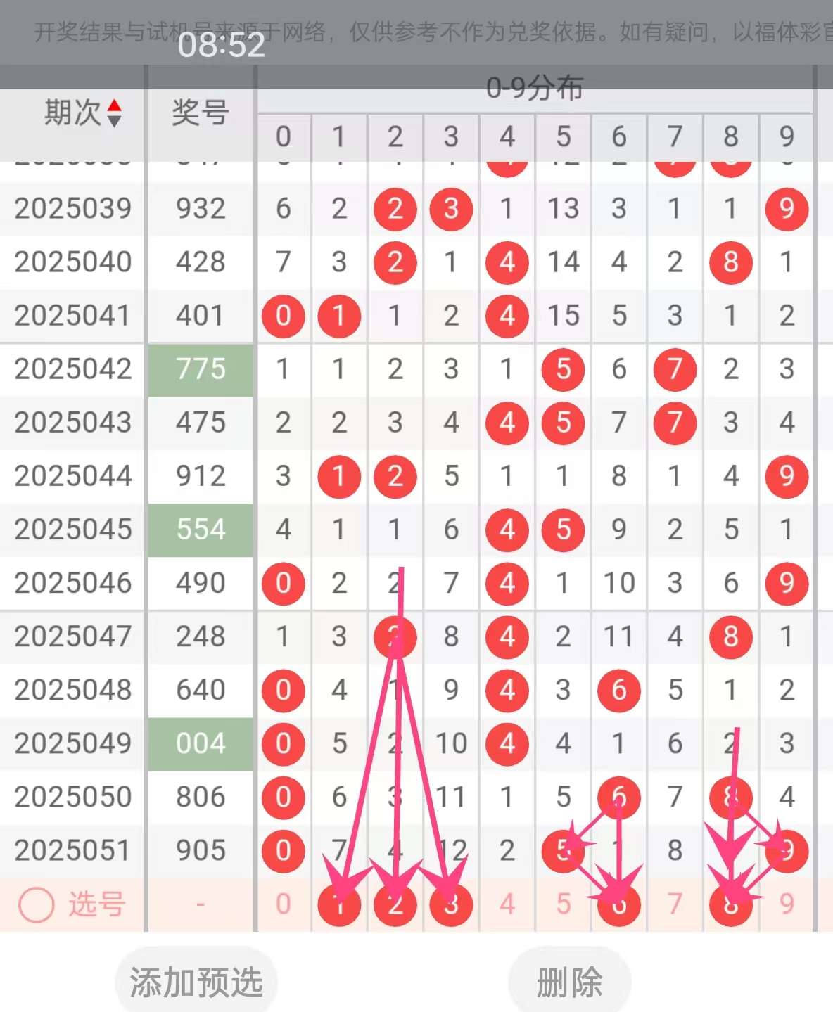 -个位“8”:个位“8”在2025047期2,4,8后遗漏5期,但历史数据显示其具有“热-冷-热”交替规律,当前处于热态边缘。