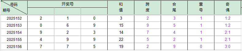 2025156期开奖号码775,我们可以看出近30期百位7出现4次,十位7出现1次,个位5出现3次。