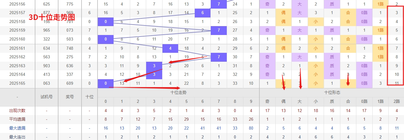 福彩3D十位分析:第2025165期十位开出号码0属小偶数号码前端。以历史100期数据为例十位奇偶比约为52比48,大小比约为53比47近期大小相差3点,根据求均衡的规律开出小数的概率比大数高一点。上期我们分析奇数经过连续回补后有走偶数的可能,开出奖号0小偶数符合我们的预期。通过对十位的振幅走势来看,上期十位走出3个振幅落位号码为小偶数号码球0,那么在对本期号码进行分析时我们可以看出近期在十位落位的号码整体振幅的跨度比较小,但基本在两三个周期就要进行一次调换,那么本期十位号码走出了落位方面我们重点考虑大号码为宜,近期3D十位走势中,5和8持续低温,尤其8已遗漏长达33期,远超平均遗漏值,回补压力较大,可重点防守其解冻信号。而热号9近期表现活跃,多次连开形成强势趋势,需防范其持续走热。采取"冷热搭配"策略,冷号关注8的触底反弹及5的间隔回补,热号追踪9的重复或斜连形态,同时注意温号3、6可能出现的过渡走势,所以福彩3D第2025166期十位推荐45689。本文由一起彩钱是生命动力所著,请勿转载
