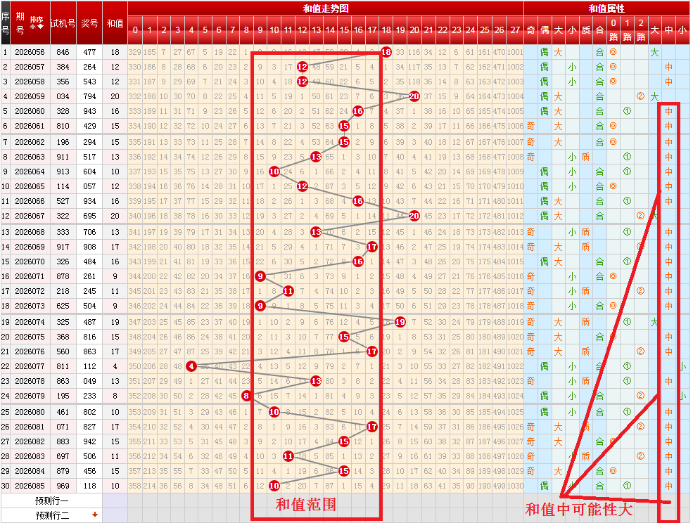 从上图可以开出,按和值大(18-27)中(9-17)小(0-8)分区,上期开出和值中,按近期趋势和跟随表现,本期继续和值中可能性大,和值大致在9-17间。