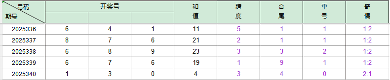 2025340期开奖号码130,我们可以看出近30期百位1出现5次,十位3出现2次,个位0出现5次。