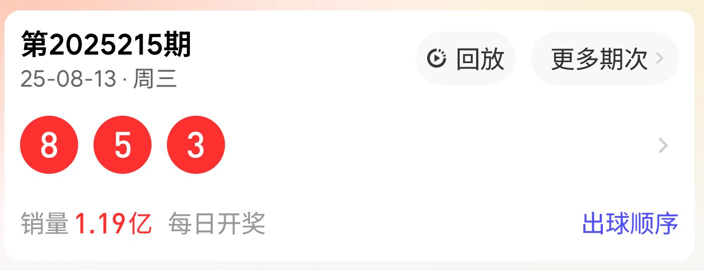 让我们先简单回顾上期开奖,然后开始今天的号码分析与推荐。福彩2025215期开出奖号为853,和值16,两大一小,两奇一偶的组六形态号码。近期的开奖号十分均衡,豹子过后,全顺组合,对子与组六的交替出现。这也让我们的分析有了更好的参考范围。