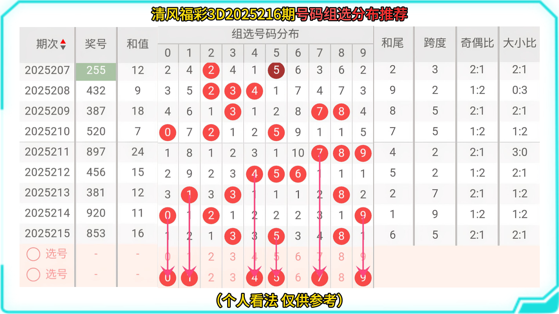 最后再把所有号码进行总结归纳,在综合上面的详细分析结合我个人的判断和看法,福彩3D216期分析综合推荐为: