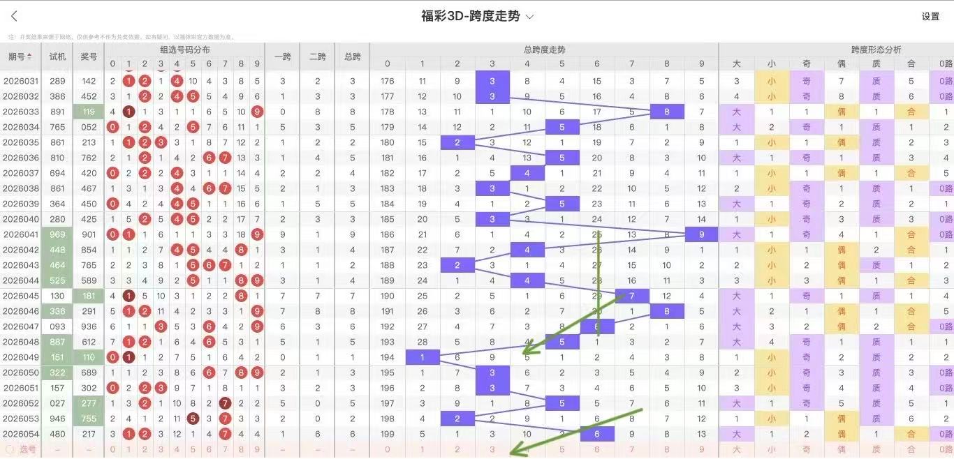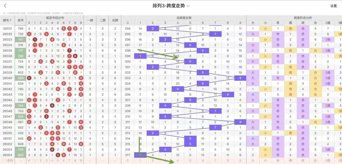 10期内跨度走势为:3-7-3-9-7-2-5-5-3-1,10期内大小跨比为5:5,奇偶跨比9:1,百期内跨度1共开出6次,下期数据:8 5 6 3 5 近期较热,考虑跨度1开出后容易出大跨度,近期大小规律大:奇:质,所以接下来继续小跨,奇跨度表现!