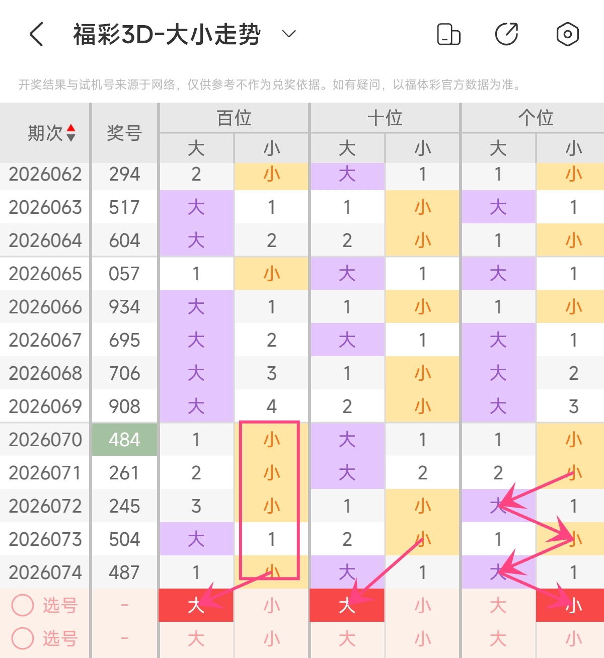 上期大小形态小大大,大小比2:1,大数占优形态。根据近期大小形态来看,近期大小形态开出多为小数号码占优形态,上期大小比才·回补了大数号码占优形态,预计本期大小形态会继续回补大数号码占优形态,预计本期大小形态可以注意大小比2:1,大数号码占优组合。本期可留意形态组合:大大小。