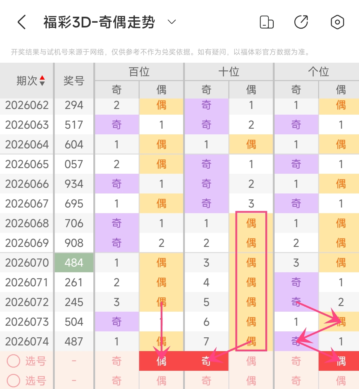 上期奇偶形态为偶偶奇,奇偶比1:2,偶数号码占优。根据近期奇偶形态变化来看,近期奇偶形态开出多为偶数号码占优形态,近期奇偶比1:2已经连续开出,预计本期奇偶比会继续延续这个趋势,预计本期奇偶形态会继续开出偶数号码占优组合。预计本期奇偶形态可关注奇偶比1:2,偶数占优组合 。本期奇偶形态可重点关注:偶奇偶。
