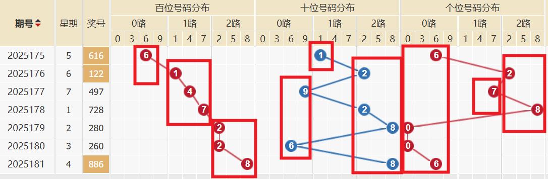 近七期开奖百位共开出冷号1枚,温号2枚,热号4枚;012路比为1:3:3。基于动态平衡干预,本期开奖号码倾向于0路和2路,基于概率补偿机制,本期重点关注2,6,8,9。近七期开奖十位共开出冷号1枚,温号1枚,热号5枚;012路比为2:1:4。基于动态平衡干预,本期开奖号码倾向于0路和2路,基于概率补偿机制,本期重点关注0,2,5,8。近七期开奖个位共开出冷号0枚,温号3枚,热号4枚;012路比为4:1:2。基于动态平衡干预,本期开奖号码倾向于1路和2路,基于概率补偿机制,本期重点关注1,2,4,8。