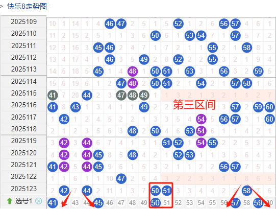 三区间开出了5个奖号(42.44.50.51.58)上期回顾三区开出5个奖号上期的三区间的奖号数量呈现一个递增的形态,本期先来看号码41近期出现频率相对较温冷,具有一定的间歇性。有时间隔期数不长但是它是一个间隔比较规律不算很稳定的一个号码,说明其在近期的开奖中较好,出现稳定但又有一定的波动,号码45在近 30 期内出现次数相对较温热,近期的活跃度也是比较好的。有一定的间歇性,通常间隔多期会出现一次,有明显的连续出现态势,走势相对较稳定,在整个第三区间的表现还是很好的。号码557走势相对近期较热,有时会间隔几期出现一次,近期有连续间隔落号的情况,活跃度近期处于热态注意防守。