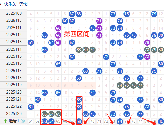 上期四区间开出了8奖号(63.64.65.69.70.73.75.77)上期的四区开8个奖号呈现了一个递增的趋势,开出的奖号分布在了7头回补了4个,6头也是在上期回补了4个号码,要是按照现在的走势的话本期应该开出的奖号会稍微递增或者不变形态,这个区域现在是开始在变化本期奖号应该会小变动,先来看号码63在近 30 期内属于比较热的号码,近期出现频率相对较热,偶尔会间隔多期后出现一次,走势近期间隔较稳定这个号码要注意防守,68具有一定的间歇性活跃度较温热,比如有时会间隔 3到4期就再次出现,也有时会间隔多期,近期整体出现频率较温热,走势相对平稳一定的波动性,近期还是要关注的.号码74活跃度近期比较热,有一定的间歇性。活跃度近期算稳定,偶尔也会相对连续地出现,整体走势有一定的波动性。