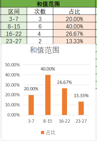 上期和值是10,处在8~15之间,各个类型占比没有变化。目前是8~15占比最优,其次是16~22,然后是3~7,最后是23~27。本期看好和值在8~15之间,其次是16~22。