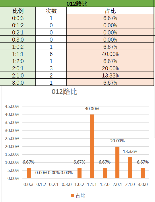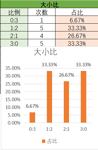 上期大小比为1:2,各个类型占比没有变化。可以看到近15期内3:0和1:2优势最好的,其次是2:1,最后是0:3。本期看好1:2开出,其次是2:1。