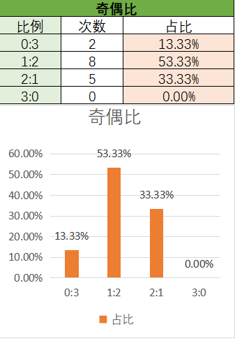 上期奇偶比为0:3,其中0:3占比变大,1:2占比变小。近15期内1:2优势最大,其次是2:1,最后是0:3。上期开了0:3奇偶比,本期看好2:1奇偶比的开出,其次是3:0。