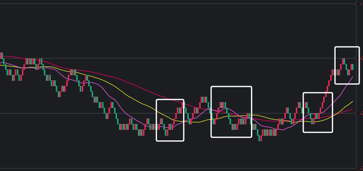 可以看到一些规律,在粉框中,如果一致,那么接下来这些跨度也会出。