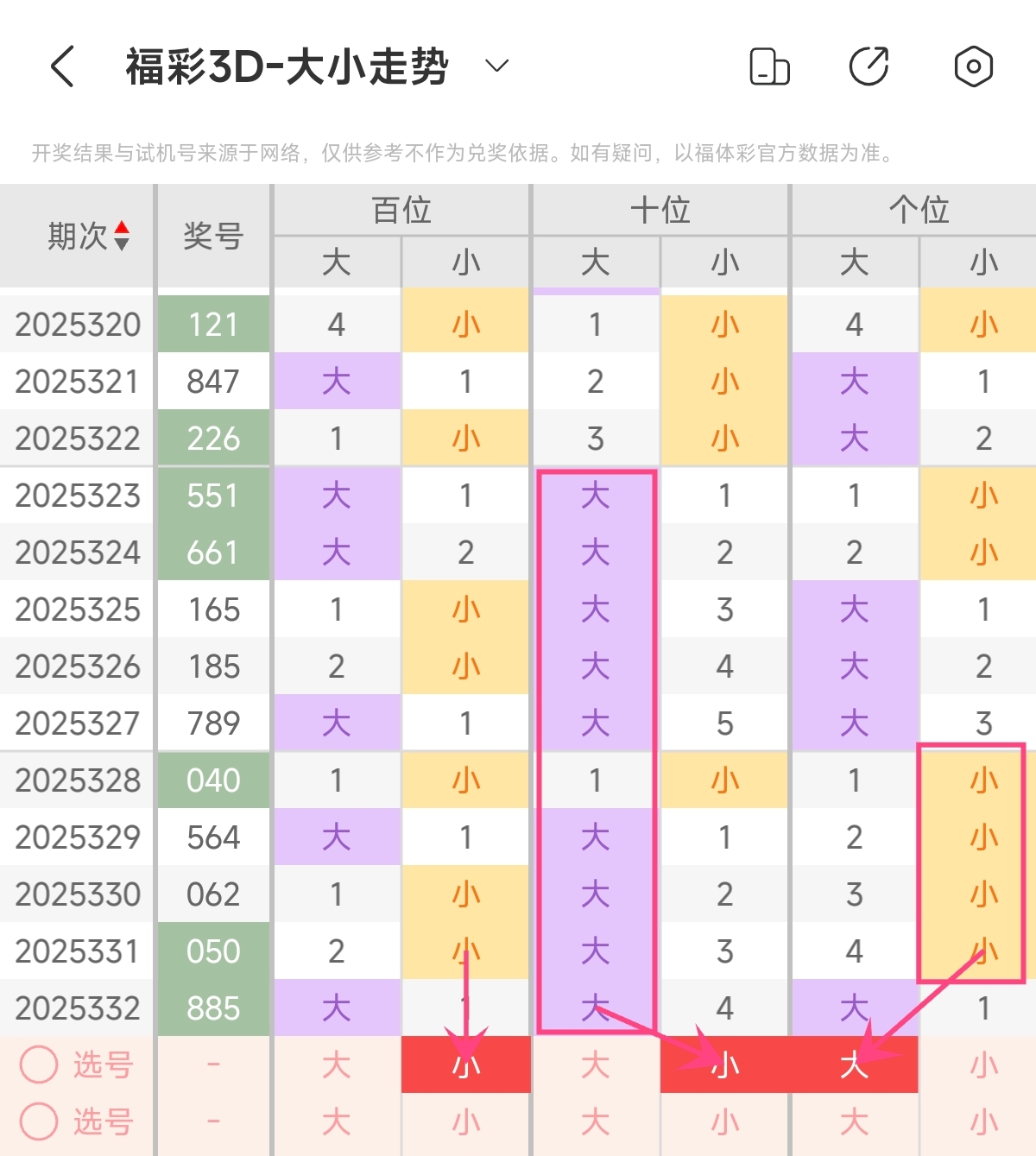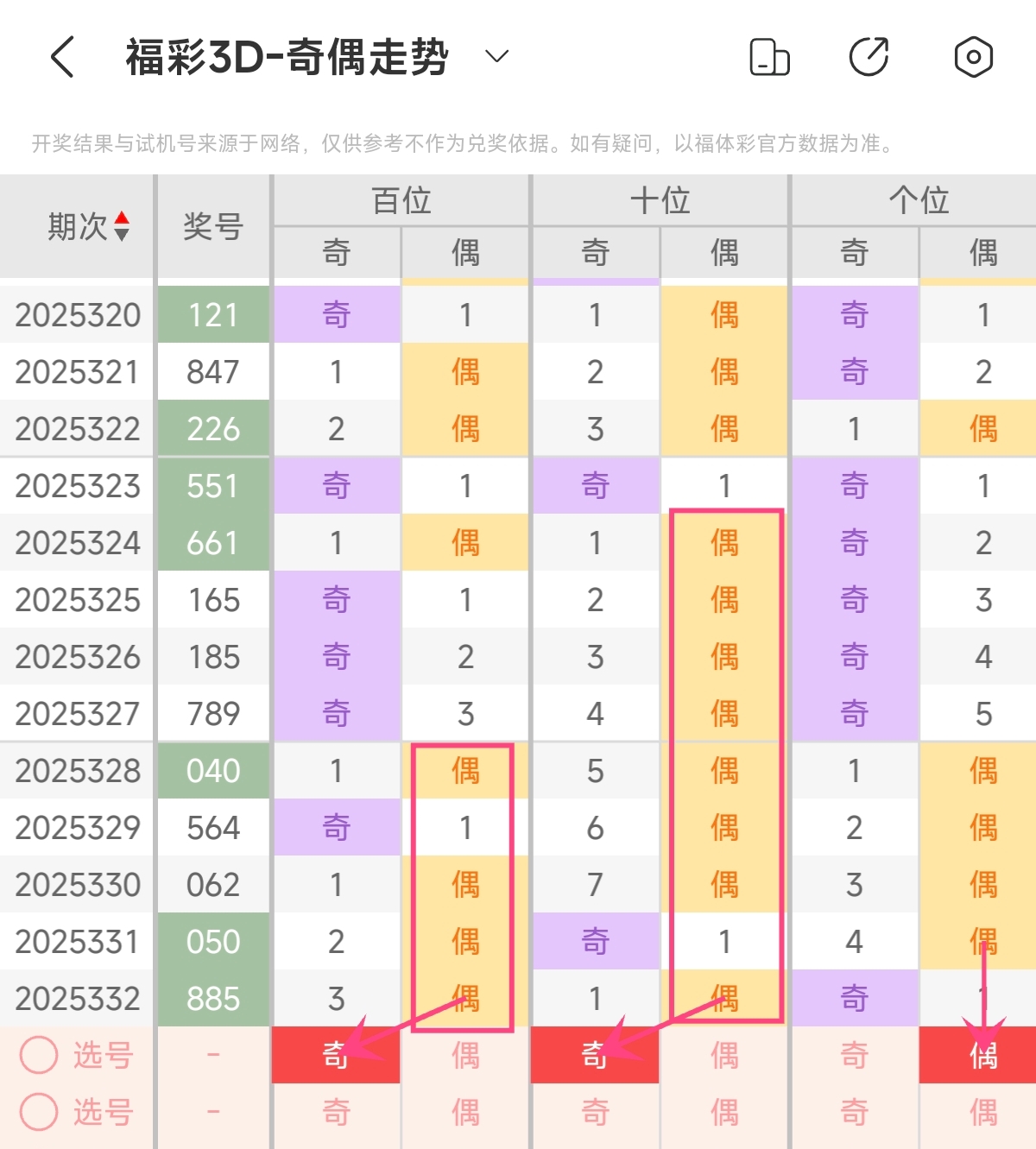 首先让我们回顾一下上期福彩3D第2025332期开奖号码为885,为组三形态,大小比为3:0 ,奇偶比为1:2,跨度为3,和值为21。