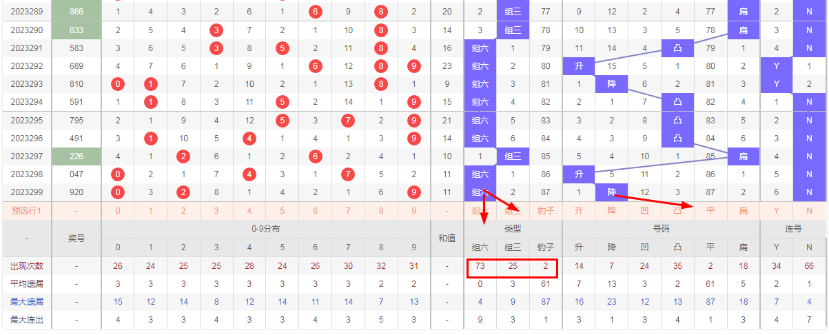 类型图分析:以历史100期为例组三和组六的比为73比25,平均一下相当于出3期组六就会有1期组三。现在的数据基本符合求均衡的特点。从形态走势图上看291期到296期出了6期组六后第297期才出了一期组三,所以结合类型走势图预判福彩3D第300期形态推荐依然组六组六为主小防组三就行。