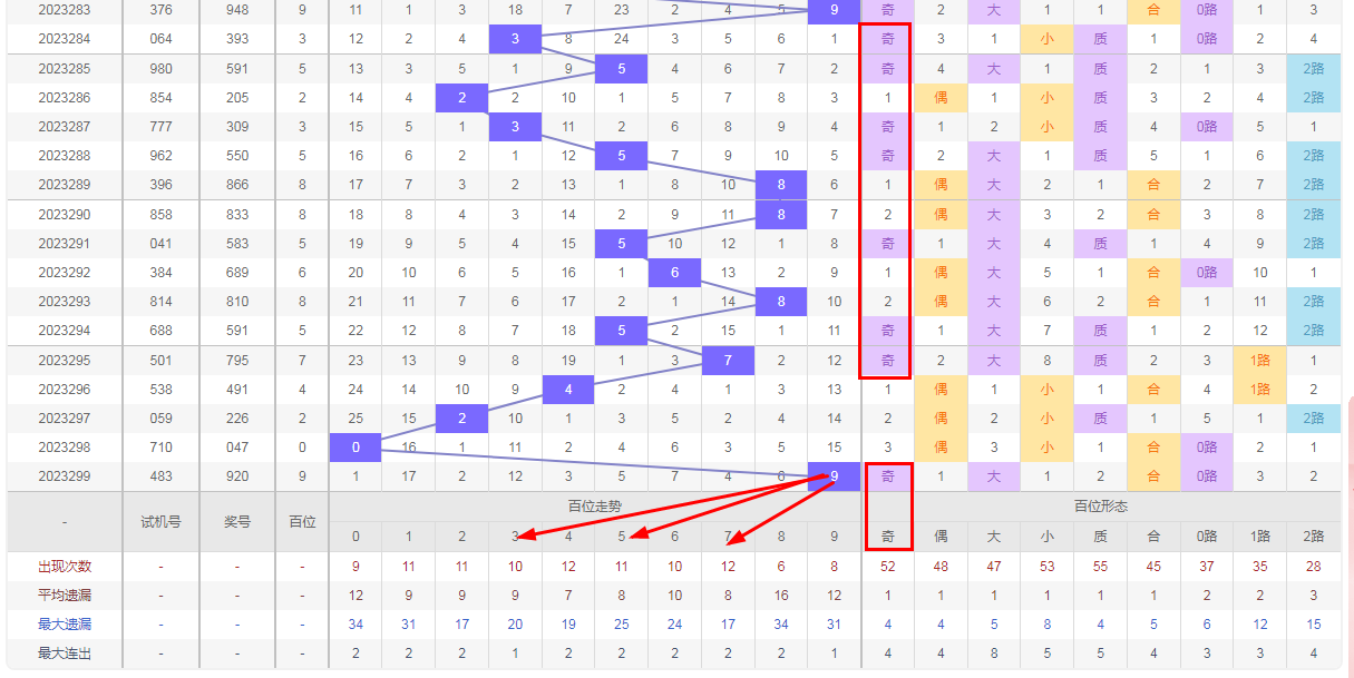 福彩3D百位分析:第299期百位开出号码9归属于大数奇数,从上面百位走势图上可以看出近100期大小比为47:53奇偶比为52:48。除了大数少几期以外其它数据还是比较均衡的。最近连续3期开出小数偶数,历史100期内偶数最大连出为4期第299期回归奇数后预计会延续2期。所以福彩3D第300期百位推荐以奇数为主,号码6在走势图连接后成黄金三角的漂亮图形。要注意防守。