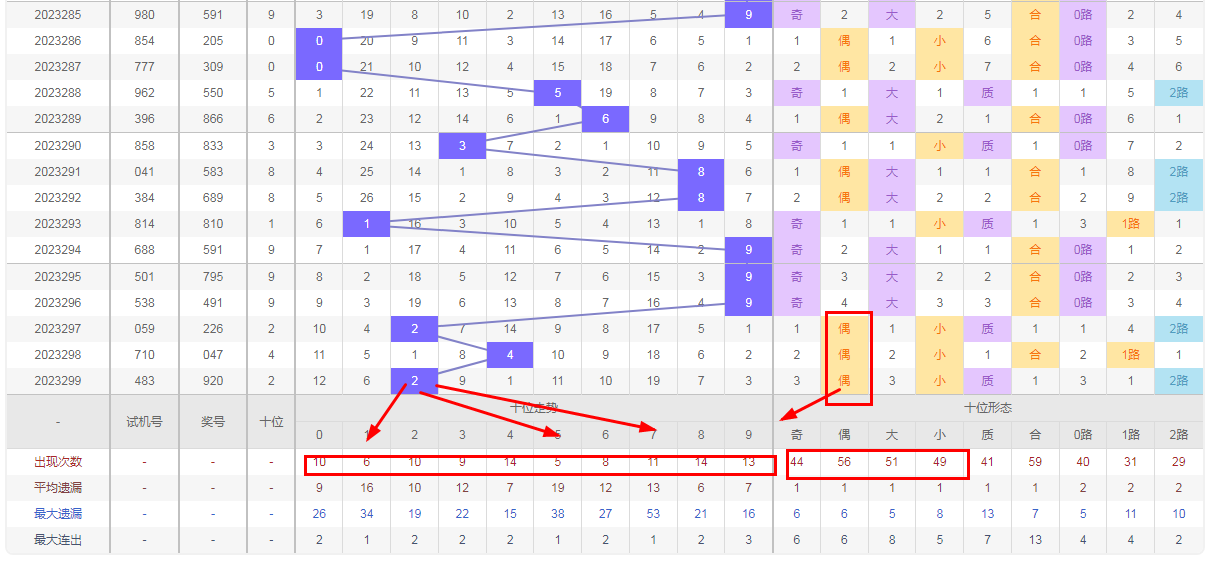 福彩3D个位分析:第299期个位号码0属于小数偶数,从以上个位走势图中可以看出近100期的大小比为54:46奇偶比为52:48大小数据上有点差异有向小数的需求但不是太明显,奇偶上的差距6点也在可接受范围,不太好看这时就要借助连线走势和遗漏数据来帮助我们缩水号码。从个位连续走势图上能看出向小数方向走到号码0后有拐头向小数的迹象。号码246 100期内出现次数也少于其它号码有回补需求,结合起来明显走向小数偶数的概率比走其它号码的概率大一点。因此福彩3D第300期个位看好小数偶数246.防守大数8 9
