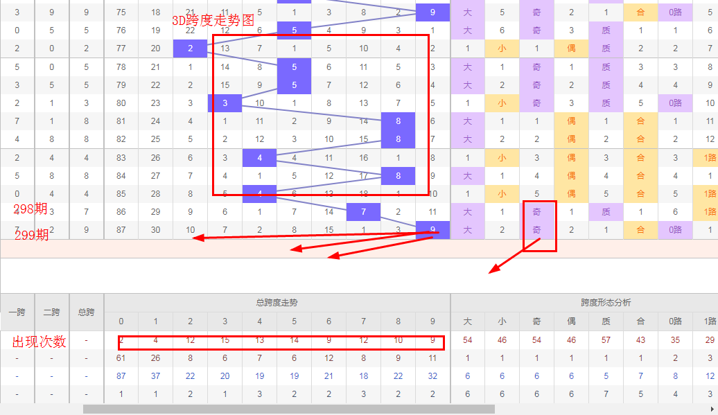 跨度分析:历史100期跨度大小比为54比46奇偶比为54比46,整体处于均衡状态,最近几期的跨度走势为一大一小走势,第299期大跨直落1期后,回归小数跨度的概率更高一点。上期开出大跨度9连线走势已到尽头将拐头向小跨度方向但跨度9近100期内出现次数少于其它跨度。防止9跨直落。3D第300期跨度参考2369跨。