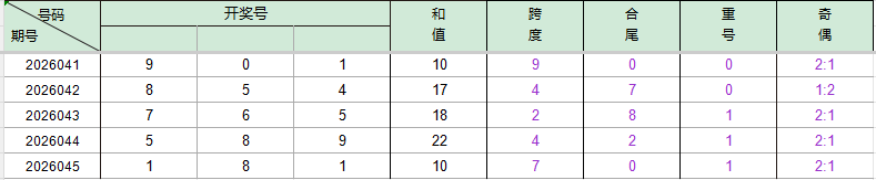 2026044期开奖号码589,我们可以看出近30期百位5出现3次(较045期减一),十位8出现3次,个位9出现5次。