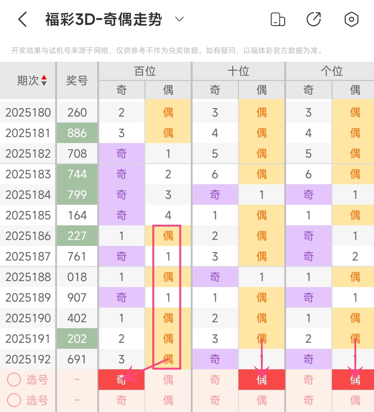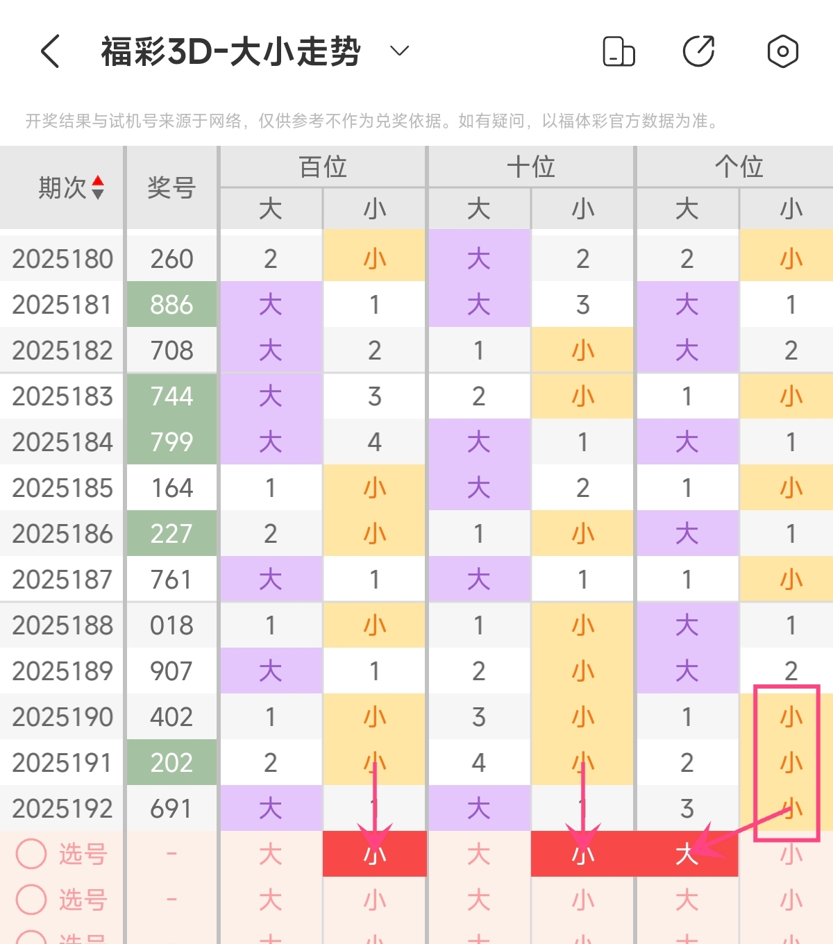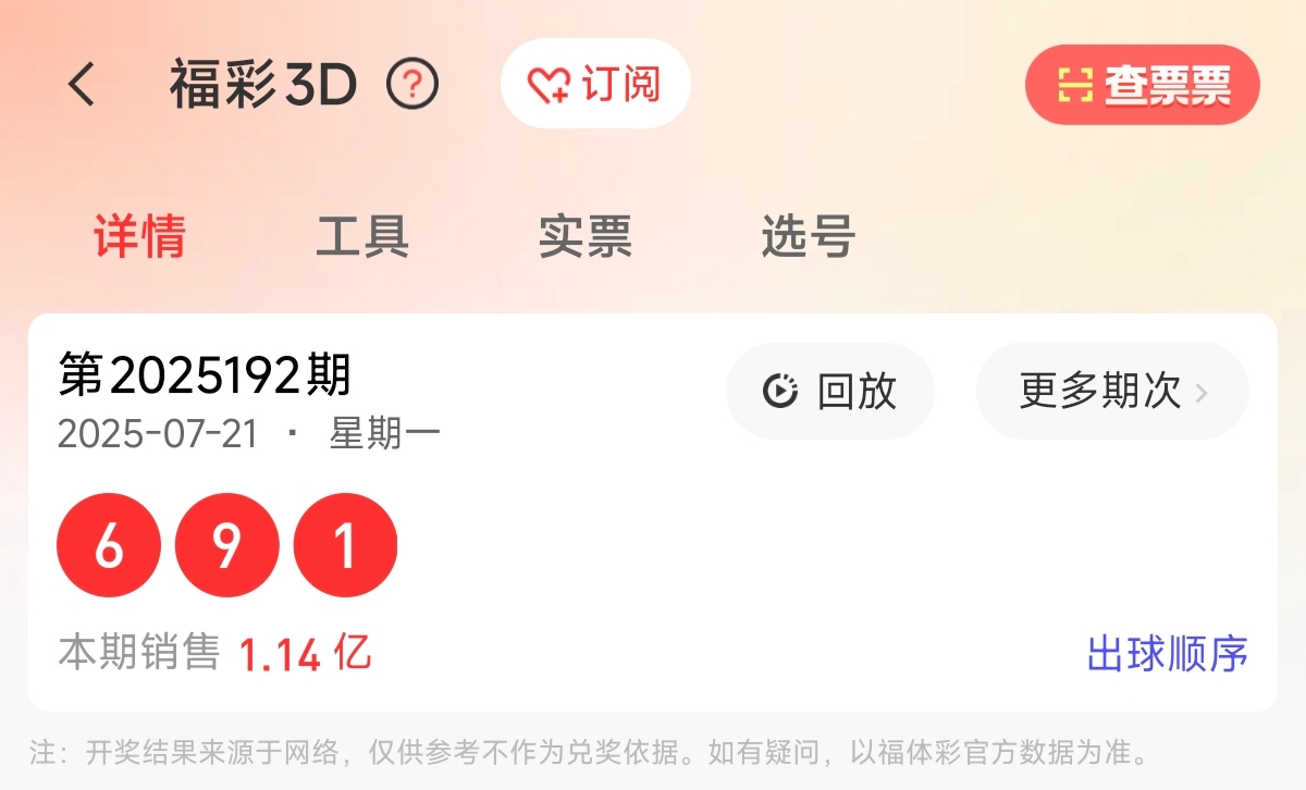 首先让我们回顾一下上期福彩3D第2025192期开奖号码为691,为组六形态,大小比为2:1,奇偶比为2:1,和值为16,跨度为8。
