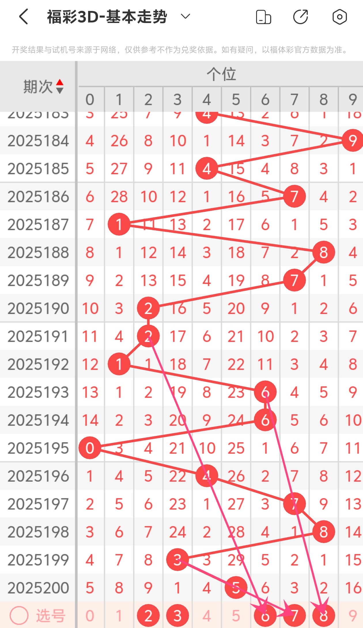 上期个位开出5,本区与上期的跨度为2,本期我们可以从上面走势图中看出选号的思路,6为斜连走势跨度为一,7为斜连走势跨度为二,8为斜连走势跨三,综合以上分析,本期个位推荐:23678