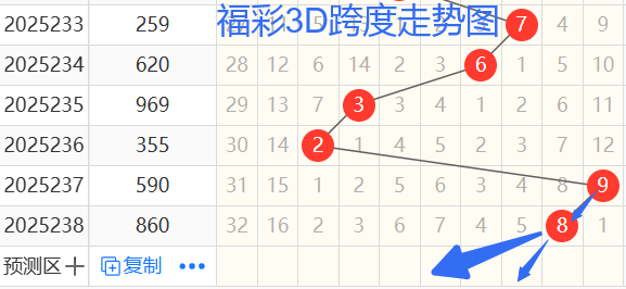 依次是63298跨度,按照路数转换关系来看,那么跨度我们暂定258369跨,本期个人比较看好5 7防2跨。