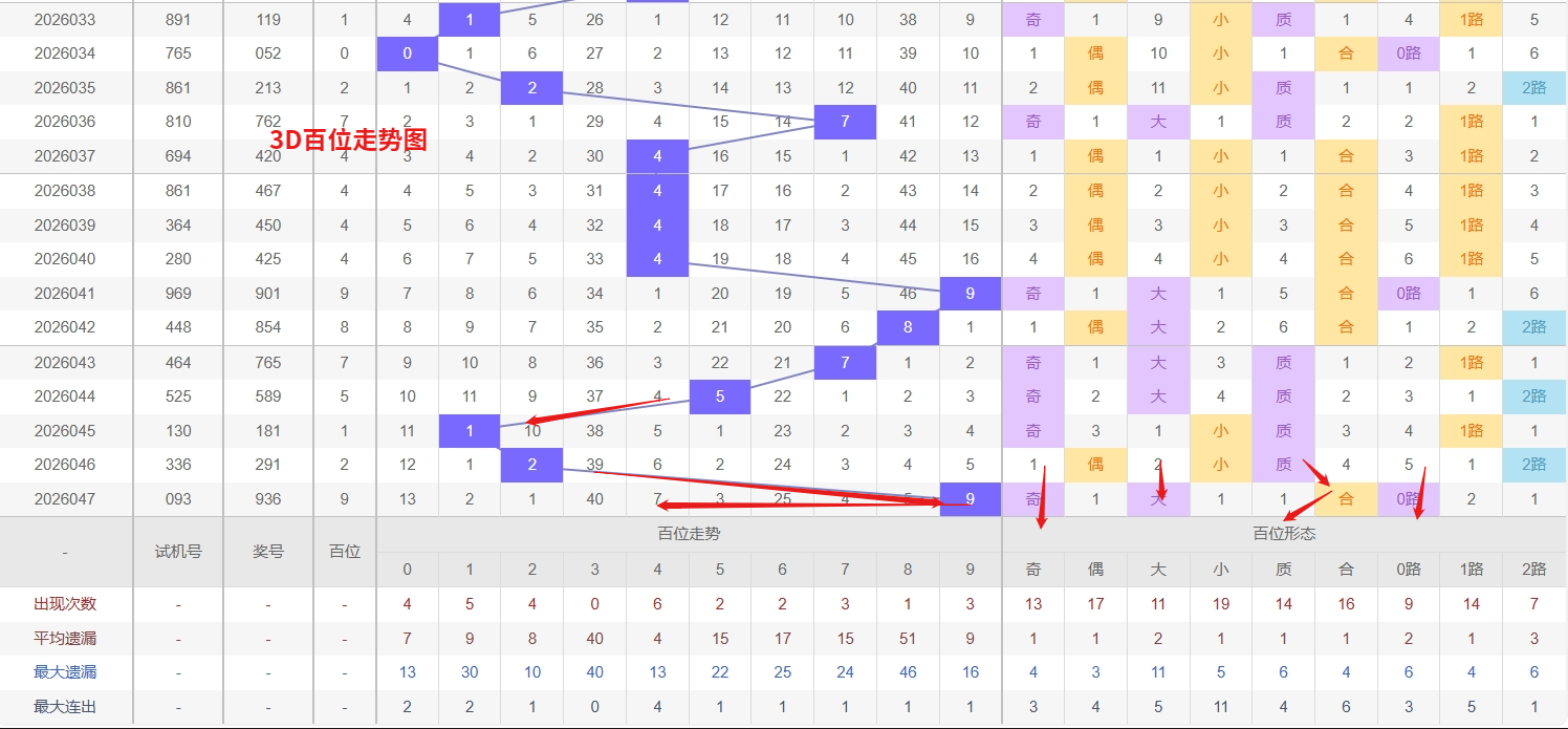 福彩3D百位分析:第2026047期百位开出号码9属于大奇数,从上面百位走势图上可以看出近100期大小比约为55:45奇偶比约为53:47。近期数据还是比较极端的符合文章开头介绍的求均衡规律非等量现象。但这种均衡不会持续最终会被偏态运行打破,然后循环往复。但短期内大小相差7点,小数过热大数有回补需求本期个人认为走大数的概率更高。上期百位落号“9”号球,在百位号码开出0路号码9后向大数方向走出7个振幅。那么通过分析上期百位落位号码分析,号码走出7个振幅,号码走为大奇数,开出0路号码9。通过对百位落号趋势来分析,百位号码落位后端,通过对近10期的走势来看百位号码大小交替频繁走2期大数又走3小数,3D百位走势,近期一个显著的形态是冷热两极分化:一方面,号码3已深度遗漏长达40期,从统计学和回补概率来看,其作为极冷码的反弹动能正在积聚,是未来几期需要埋伏的重点;另一方面,号码1和4则呈现出明显的热态,近期出号频率较高,根据热号延续的规律,它们在接下来的走势中仍需重点设防,不可轻易排除。因此,当前策略应兼顾冷热两端,既要紧盯3这个冷号的回补契机,也要对1和4的再次热出保持警惕。我们在百位关注的重点在13468这5个号码球上,百位号码近期奇偶切换频繁,9号球码属于0路号码奇数,现奇数开出过多有向偶数的趋势。所以福彩3D第2026048期百位看13468本文由一起彩钱是生命动力所著,请勿转载