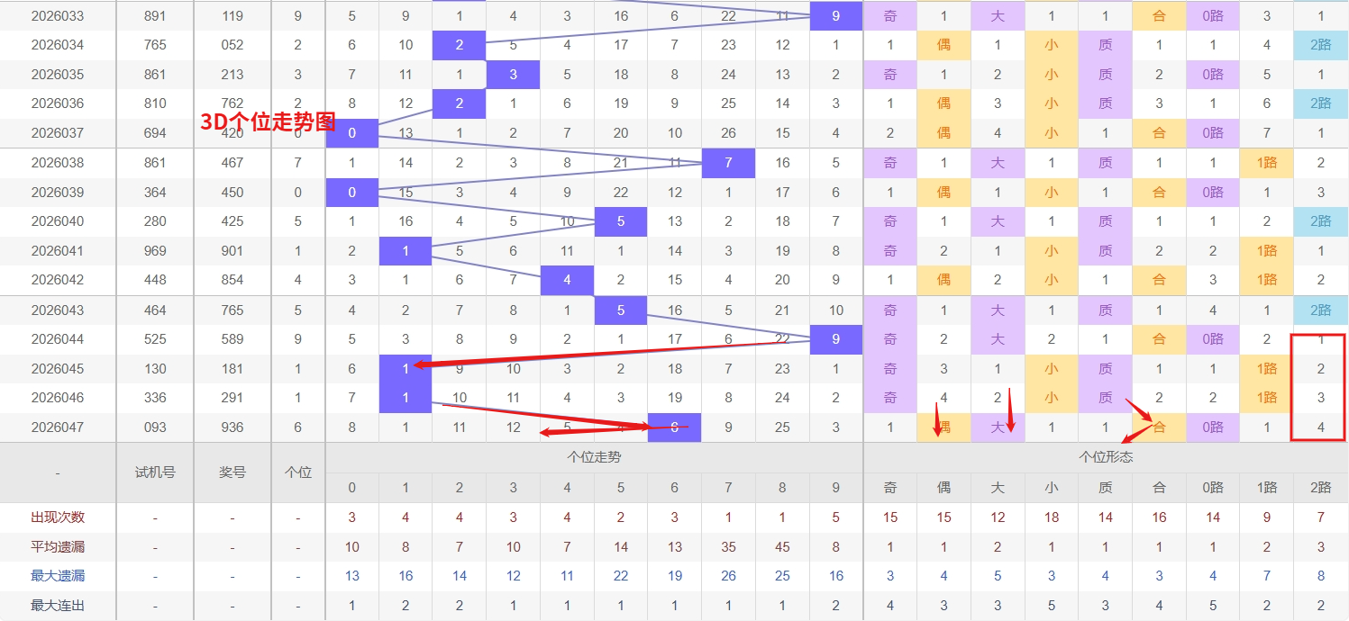 福彩3D个位分析:第2026047期个位开出号码6属于大偶数中端,从以上个位走势图中可以看出近100期的大小比约为48:52奇偶比约为55:45大小奇偶数据上有点差异有需求但不是太明显,不太好看这时就要借助连线走势和遗漏数据来帮助我们缩水号码。上期个位落号“6”大偶数2路号码球,号码开出了5振幅,连续多期的小振必被大振幅取代幅符合我们的预期,那么本期我们在个位考虑振幅走势走前依然要转变思路考虑大振幅,具体考虑(1-5)个振幅是我们主要的方向,那么在对个位落号情况进行系统的分析时我们可以明显的看到个位号码走势呈现大范围震荡,尤其是在号码的落位特点上表现的尤为突出,那么本期我们在个位分析时就要注意号码的风险,避免出现踏空。3D个位走势图来分析,当前号码8作为一个冷号,其遗漏期数已达到一定阈值,从概率上讲,它随时可能出现技术性的回补,是近期需要埋伏的重点。与此同时,号码9则表现得相当炙热,作为当下的热号,它的出号惯性很强,很可能继续在个位位置上有所表现,因此加以防范,不可轻易将其排除。总体来看,个位走势呈现出冷热相争的格局,选号策略上应兼顾两端:一方面要捕捉冷号8可能出现的反弹机会,另一方面也要对热号9的延续性保持足够警惕,因此福彩3D第2026048期个位看好02589。本文由一起彩钱是生命动力所著,请勿转载