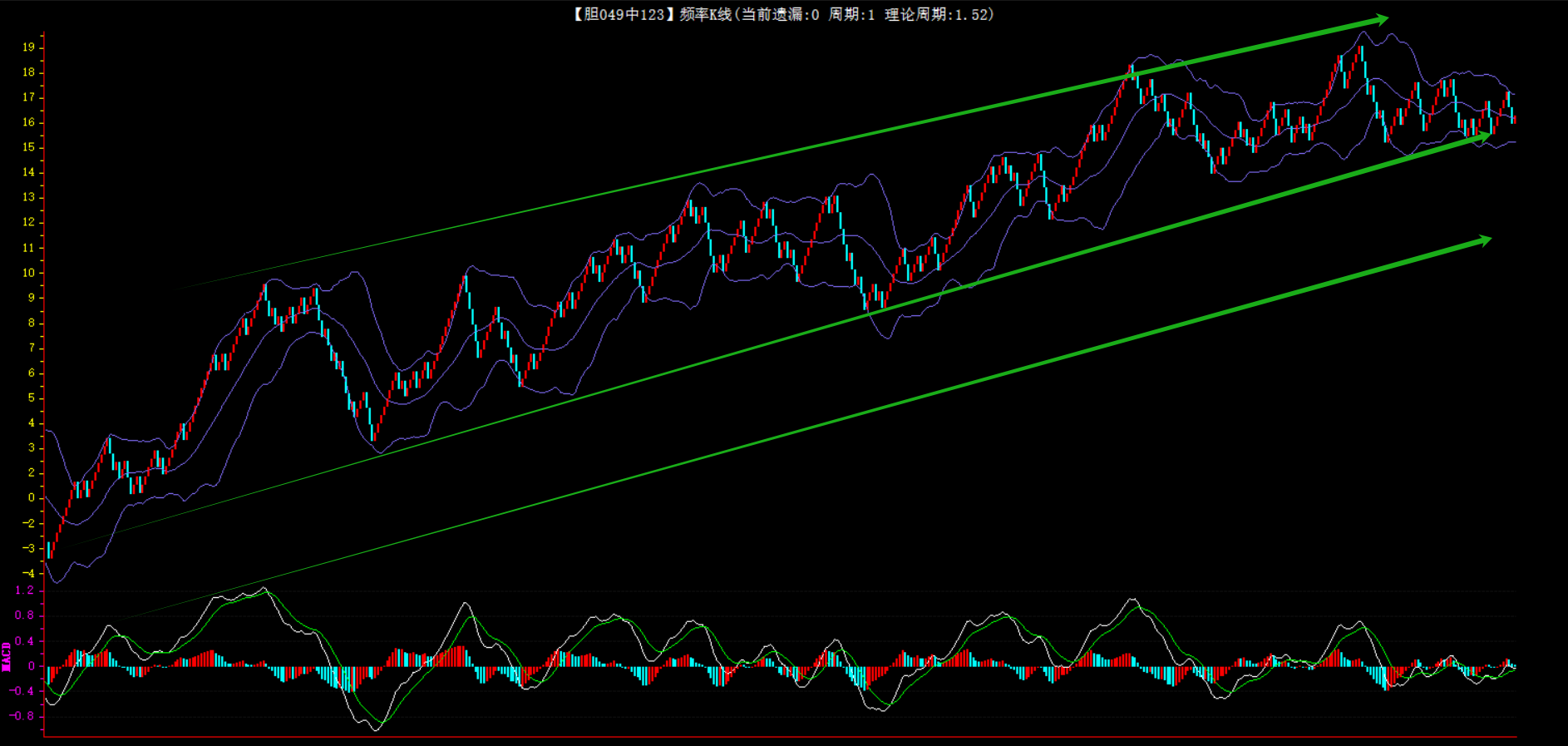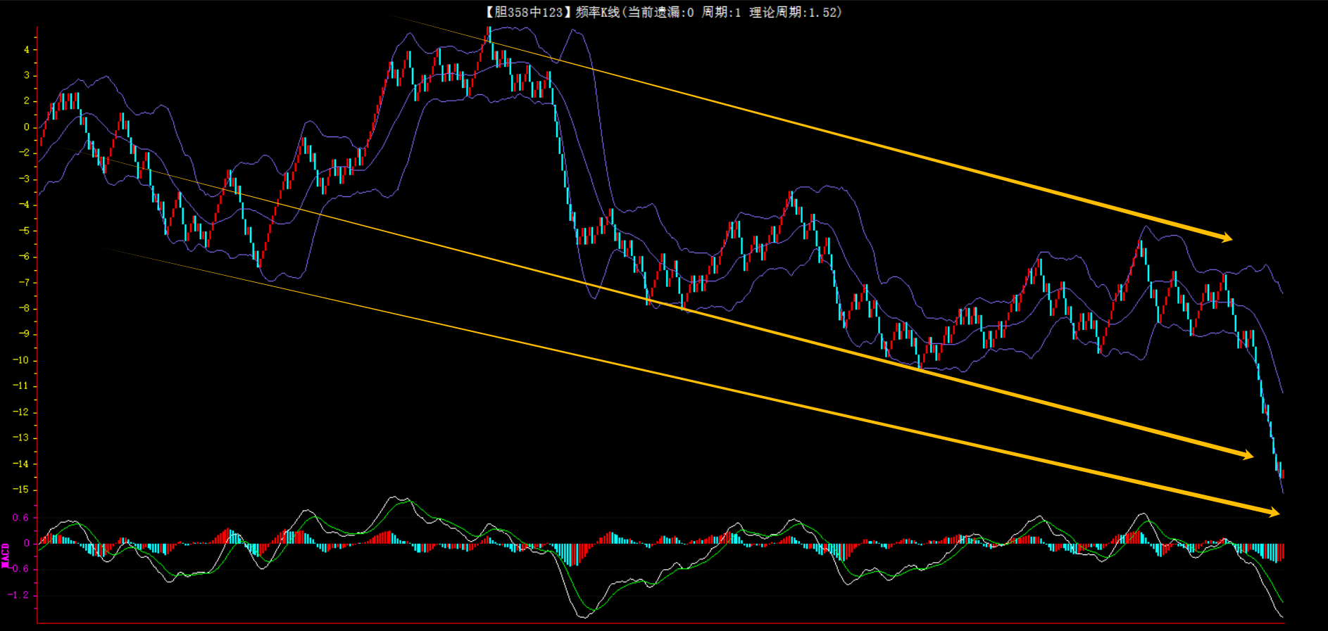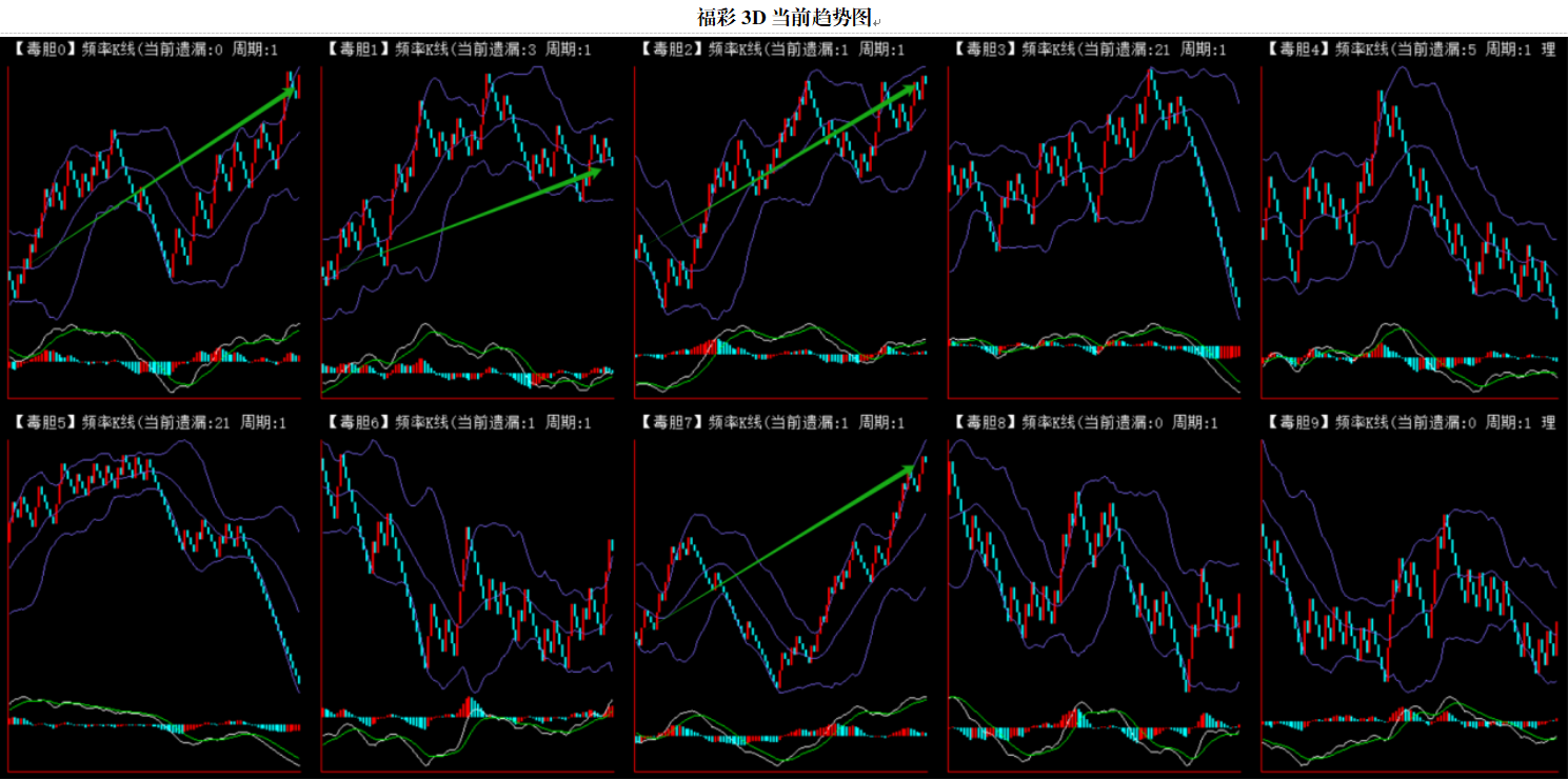 整体趋势下行,上边沿线趋势向下,下边沿趋势也是向下,节点震荡,当前遗漏1期,本期防守。