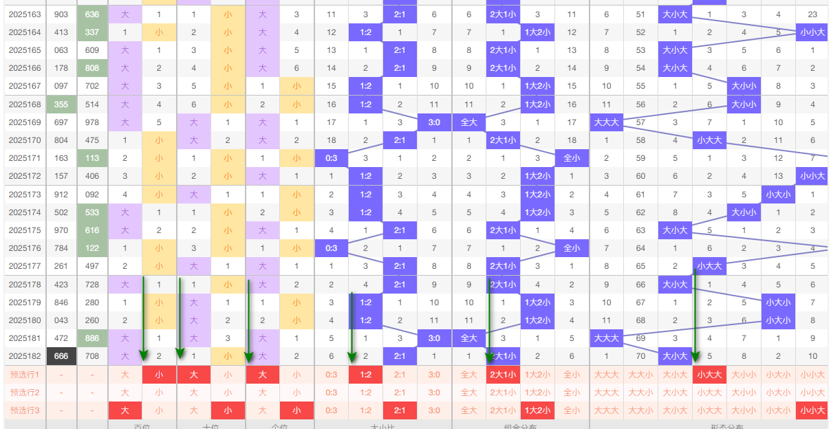 最近的5期当中十位大数出现的频次3次 小数出现2次 ,趋势平和 本期看好走大