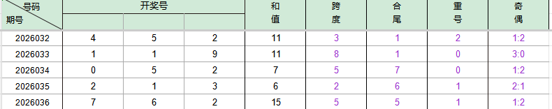 2026036期开奖号码762,我们可以看出近30期百位7出现2次,十位6出现3次,个位2出现7次。